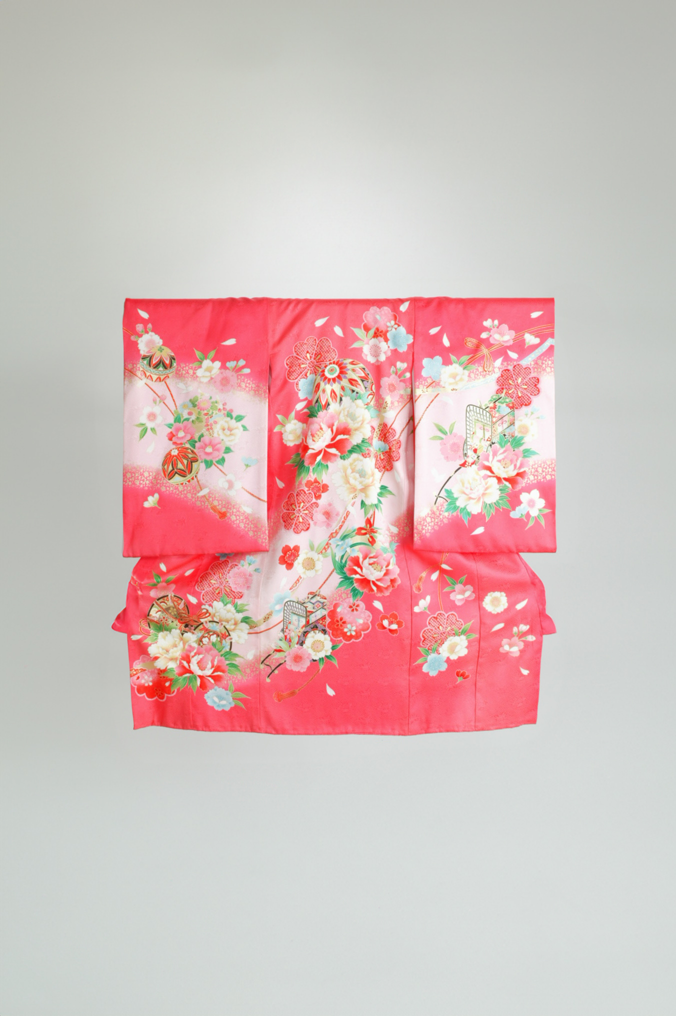 【レンタル内容】七五三着物一式…着物、長襦袢、結び帯、草履、バッグ、帯揚げ、はこせこ、帯締め、しごき、足袋、腰紐、髪飾り、扇子